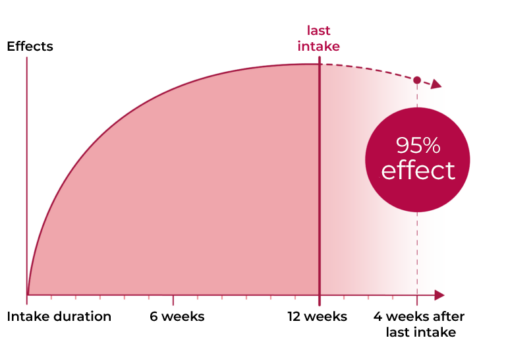 In the diagram on the right, taken from the study by Bolke L. et al., 2019, you can see how the effects of ELASTEN® develop over the course of use. The effectiveness increases continuously up to the twelfth week of intake. Even after the end of intake, the effect remains: four weeks after the last dose, effectiveness was still at 95 percent. This demonstrates that ELASTEN® not only works in the medium term but can also deliver long-lasting beauty effects.