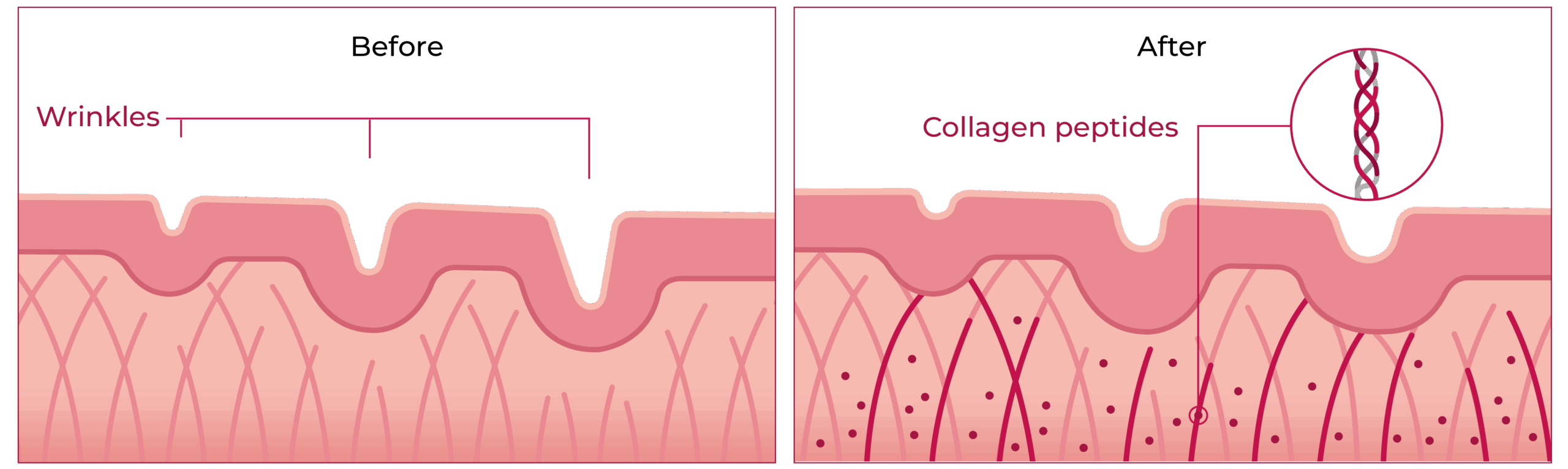 The illustration shows the difference between a weakened and a strengthened collagen network. In the left-hand image, the network is weakened, which can lead to deeper wrinkles. The targeted intake of vitamin C in combination with bioactive collagen peptides can stimulate collagen production in the dermis and allow the collagen network to slowly rebuild itself. This scenario is illustrated in the right-hand image.