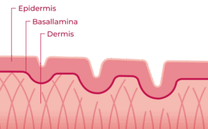 At the top is the epidermis (outer skin), below which is the basal lamina, which acts as a separating layer to the deeper dermis (corium).