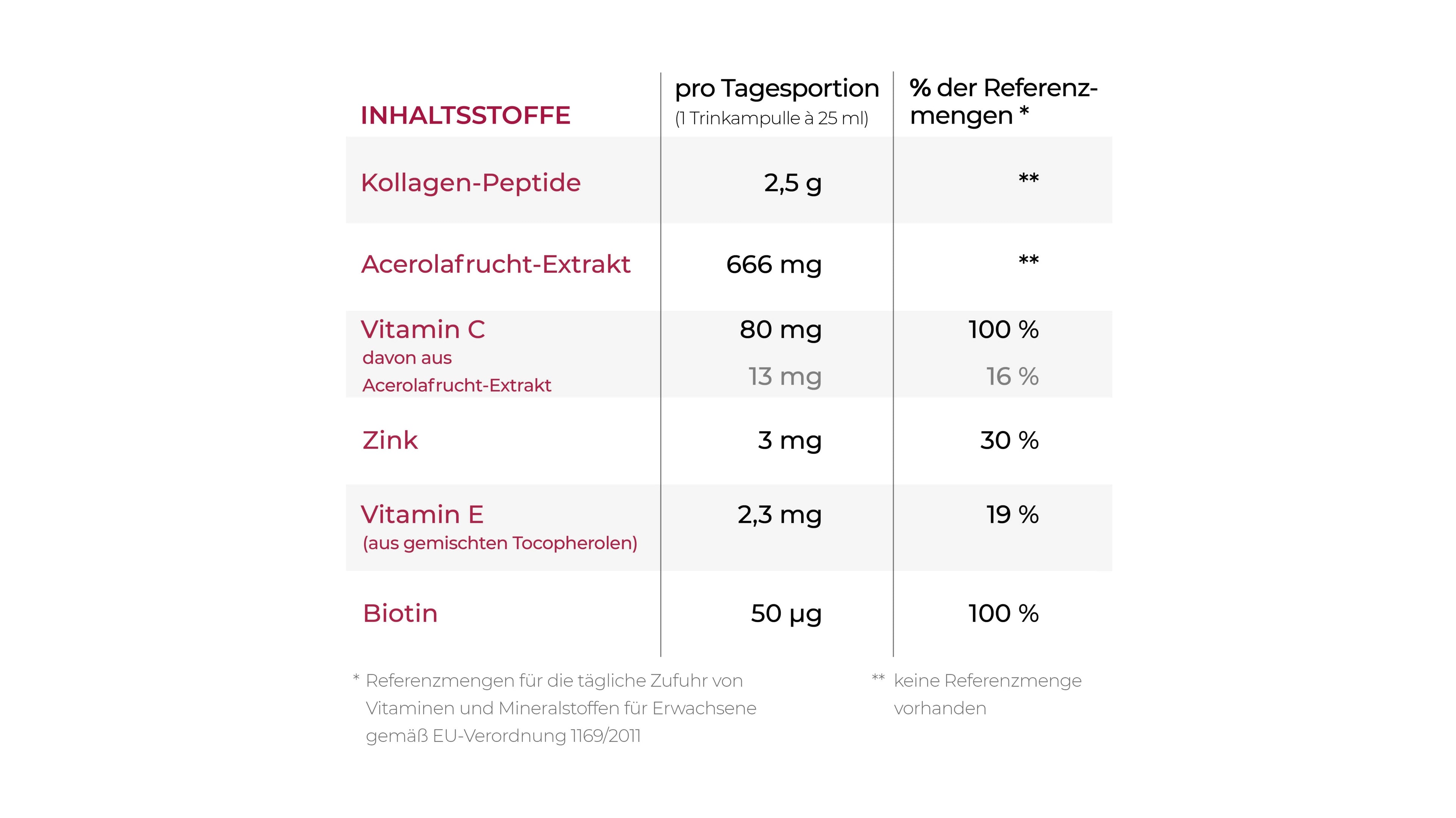 All quantities of ingredients per daily serving (1 drinking ampoule with 25 ml) and percentages of the recommended daily intake can be found in the following nutrient overview.
