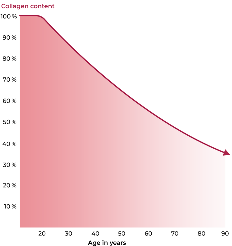 As the diagram shows, the collagen content of the skin begins to decline continuously from the age of 25. Starting at this point with the intake of skin-relevant nutrients that stimulate collagen formation is therefore advisable to support collagen production early and slow down its breakdown.