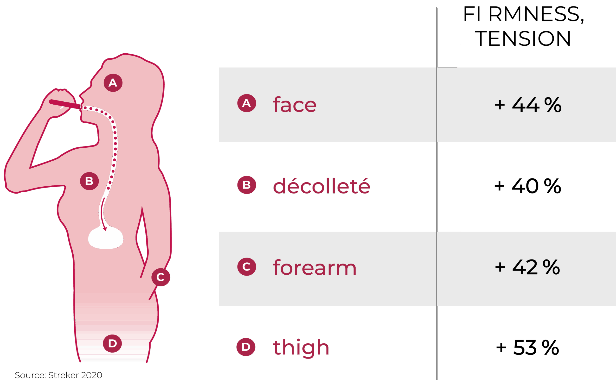 Come mostra la tabella, ELASTEN® agisce su molte parti del corpo – viso, décolleté, avambracci e cosce – e migliora significativamente la compattezza e la tonicità della pelle già dopo 12 settimane.
