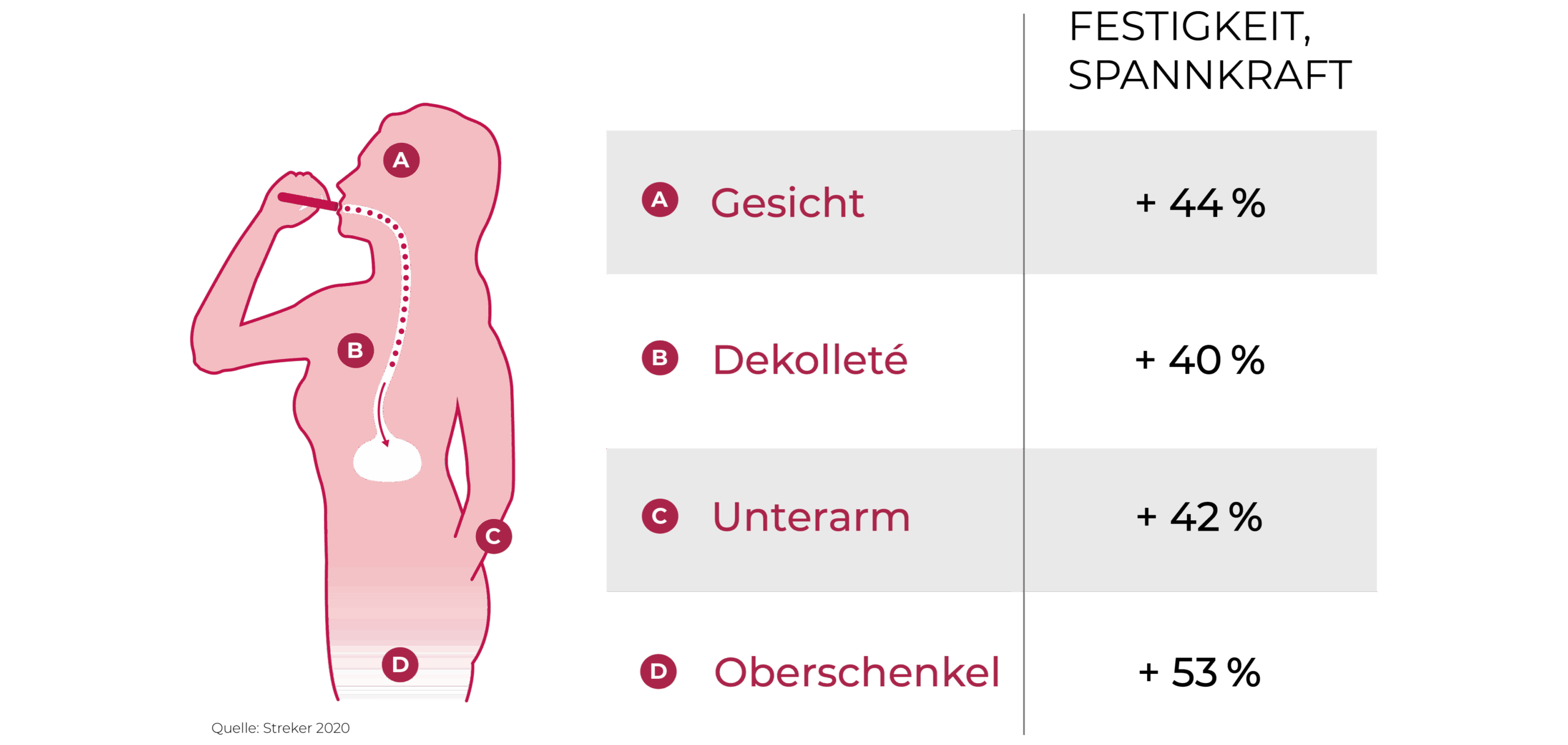 Wie die Tabelle zeigt, wirkt ELASTEN® an vielen Stellen des Körpers – im Gesicht, am Dekolleté, Unterarm und Oberschenkel – und verbessert die Festigkeit und Spannkraft schon nach 12 Wochen.