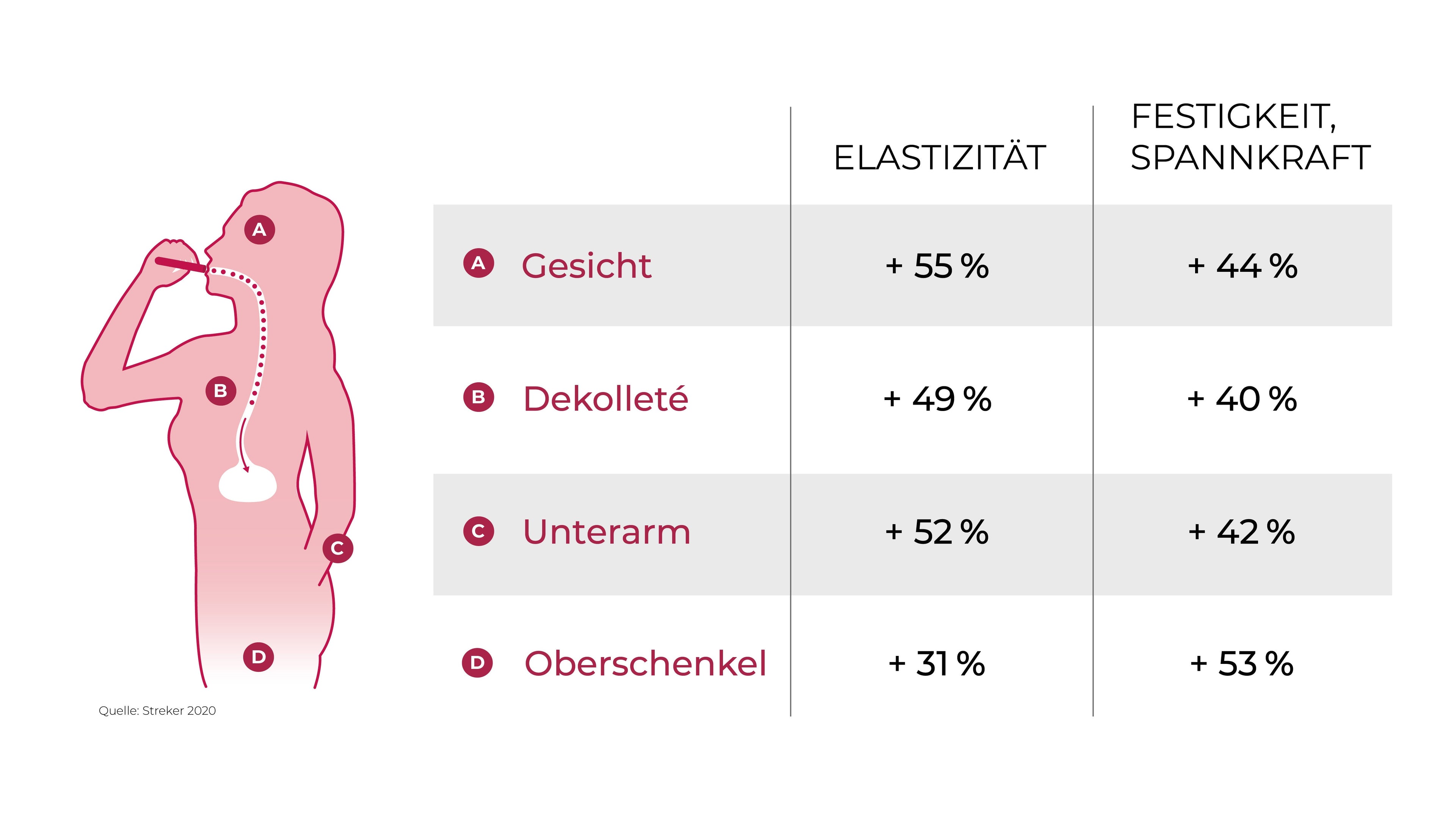 Nhờ khả năng trương nở đáng kể, collagen có khả năng giữ ẩm tuyệt vời – từ đó giúp làm căng mọng, làm mịn và săn chắc da từ bên trong. Các yếu tố như tiếp xúc với ánh nắng mặt trời, các chất độc hại trong môi trường như bụi mịn, nicotine, hormone và chế độ ăn uống có thể ảnh hưởng đến sự cân bằng collagen của cơ thể. Hơn nữa, quá trình sản xuất collagen bắt đầu chậm lại ngay từ tuổi 25 và tiếp tục giảm dần trong suốt cuộc đời.
