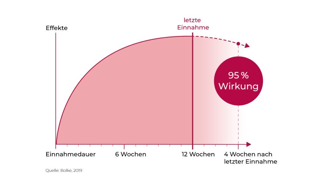 Sơ đồ bên phải, trích từ nghiên cứu của Bolke L. và cộng sự, năm 2019, cho thấy hiệu quả của ELASTEN® phát triển như thế nào trong suốt quá trình sử dụng. Hiệu quả tăng dần cho đến tuần thứ mười hai . Ngay cả sau khi kết thúc liệu trình, hiệu quả vẫn duy trì: bốn tuần sau liều cuối cùng, hiệu quả vẫn đạt 95%. Điều này chứng tỏ ELASTEN® không chỉ có tác dụng trung hạn mà còn mang lại lợi ích làm đẹp lâu dài .